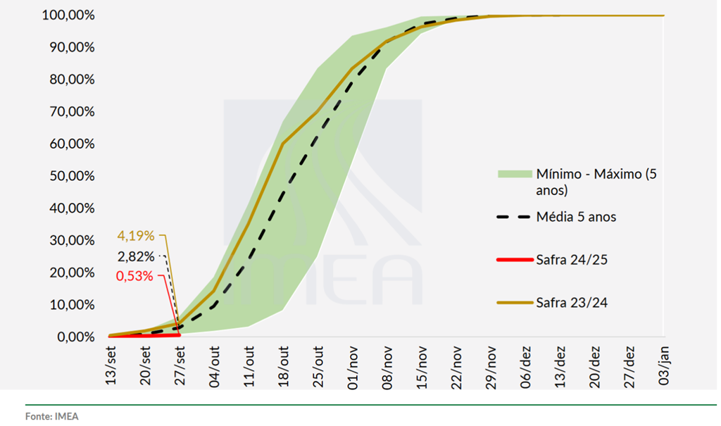 Mato Grosso - Le soya du Mato Grosso était semé à 0,5 % à la fin de la semaine dernière, contre 4,1 % l'année dernière et 2,8 % pour la moyenne des 5 dernières années selon l'Institut d'économie agricole du Mato Grosso (Imea). Cela représente une avance de seulement 0,2 % pour la semaine. Vous trouverez ci-dessous l'avancement de la récolte de soya au Mato Grosso (ligne rouge) pour le 27 septembre 2024.
