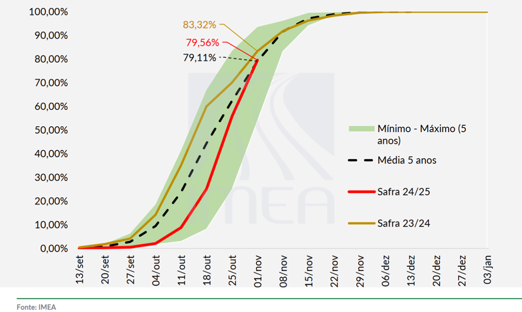 Les ensemencements ont maintenant rattrapé la moyenne, ce qui représente une grande amélioration en deux semaines. On s'inquiète toujours des retards potentiels dans les ensemencements du maïs safrinha, mais l'inquiétude est moindre aujourd'hui qu'elle ne l'était il y a plusieurs semaines. Vous trouverez ci-dessous l'avancement des semis de soya dans le Mato Grosso au 1er novembre 2024, selon l'Imea.
