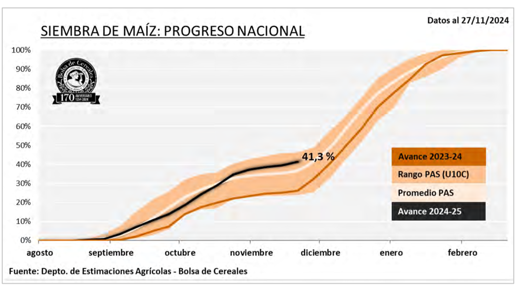 Vous trouverez ci-dessous le rythme de semis du maïs en Argentine pour le 27 novembre 2024 selon la Bourse des grains de Buenos Aires.