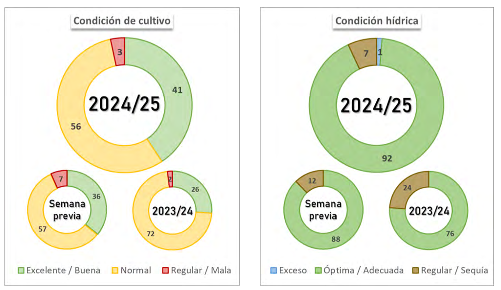 Le maïs en Argentine est classé 3 % comme médiocre/très médiocre, 56 % comme moyen et 41 % comme bon/excellent. Le pourcentage classé bon/excellent est en hausse de 5 % par rapport à la semaine précédente. L'humidité du sol pour le maïs est évaluée à 7 % comme étant déficiente/très déficiente, à 92 % comme étant adéquate/optimale et à 1 % comme étant excédentaire. Le pourcentage d'humidité jugée adéquate/excédentaire est en hausse de 4 % par rapport à la semaine précédente. Vous trouverez ci-dessous la cote du maïs argentin du 27 novembre 2024 de la Bourse des grains de Buenos Aires.