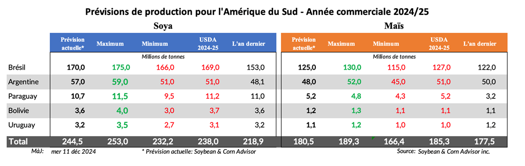 Le soya en Argentine était semé à 53,8 % à la fin de la semaine dernière, contre 51,7 % l'année dernière et 52,7 % pour la moyenne des 5 dernières années. Cela représente une avance de 9,4 % pour la semaine. Dans les principales zones de production, le soya est semé à environ 85 %, dont 50 à 70 % dans le sud de l'Argentine et moins de 1 % dans l'extrême nord de l'Argentine. Environ 69 % du soya de première récolte a été semé, et 13,8 % du soya de double récolte ont été semés. Vous trouverez ci-dessous l'avancement des semis de soya en Argentine au 4 décembre 2024, selon la Bourse des grains de Buenos Aires.