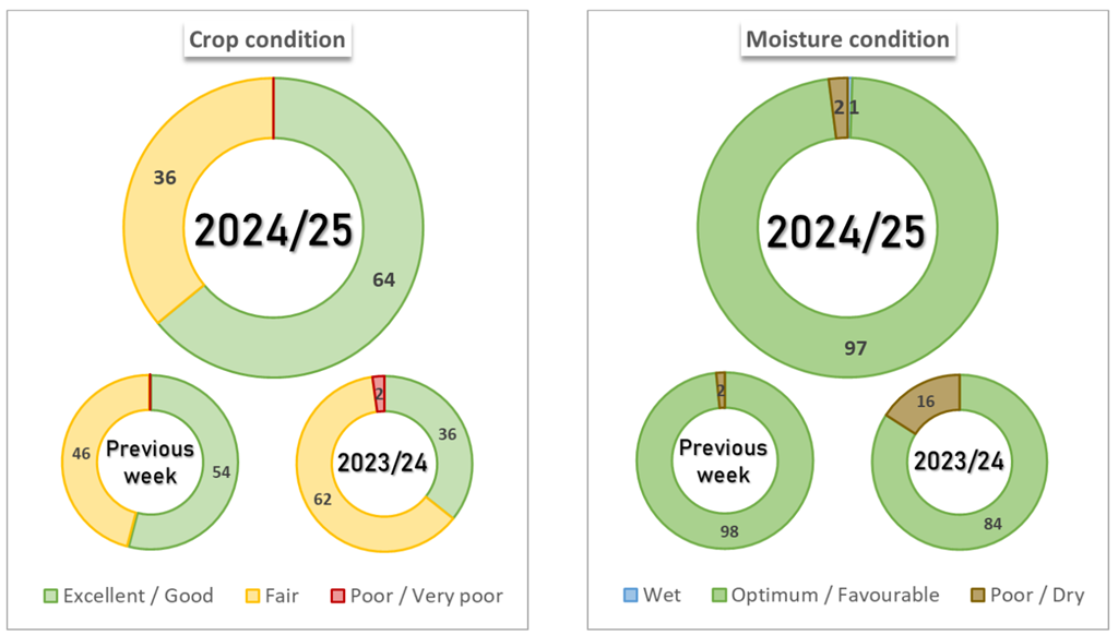 Le soya qui a été semé est en développement végétatif et classé 0 % comme médiocre/très médiocre, 36 % comme moyen et 64 % comme bon/excellent. Le pourcentage bon/excellent est en hausse de 10 % par rapport à la semaine précédente. L'humidité du sol pour le soya est classée à 2 % comme faible/très faible, 97 % comme favorable/optimale et 1 % comme excédentaire. Le pourcentage favorable/optimal est en baisse de 1 % par rapport à la semaine précédente. Vous trouverez ci-dessous la cote du soya en Argentine pour le 4 décembre 2024 de la Bourse des grains de Buenos Aires.
