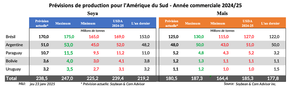 Le maïs semé hâtivement, qui remplit actuellement ses grains, a devancé la plupart des conditions récentes de chaleur et de sécheresse. Le maïs semé tardivement n'a pas eu autant de chance et a commencé à polliniser dans des conditions défavorables. L'estimation du maïs continuera probablement à baisser dans les semaines à venir, mais il reste à déterminer dans quelle mesure. La Bourse des grains de Rosario a abaissé son estimation de la production de maïs pour 2024/25 à 48,0 millions de tonnes.