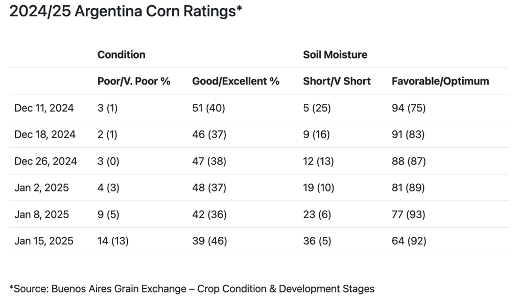 Le maïs en Argentine était classé à 14 % comme médiocre/très médiocre, à 47 % comme moyen et à 39 % comme bon/excellent à la fin de la semaine dernière. Le pourcentage bon/excellent est en baisse de 3 % par rapport à la semaine précédente. L'humidité du sol pour le maïs est classée 36 % comme déficiente/très déficiente et 64 % comme favorable/optimale. Le pourcentage favorable/optimal est en baisse de 13 % par rapport à la semaine précédente. Vous trouverez ci-dessous la cote du maïs en Argentine au 15 janvier 2025, selon la Bourse des grains de Buenos Aires.