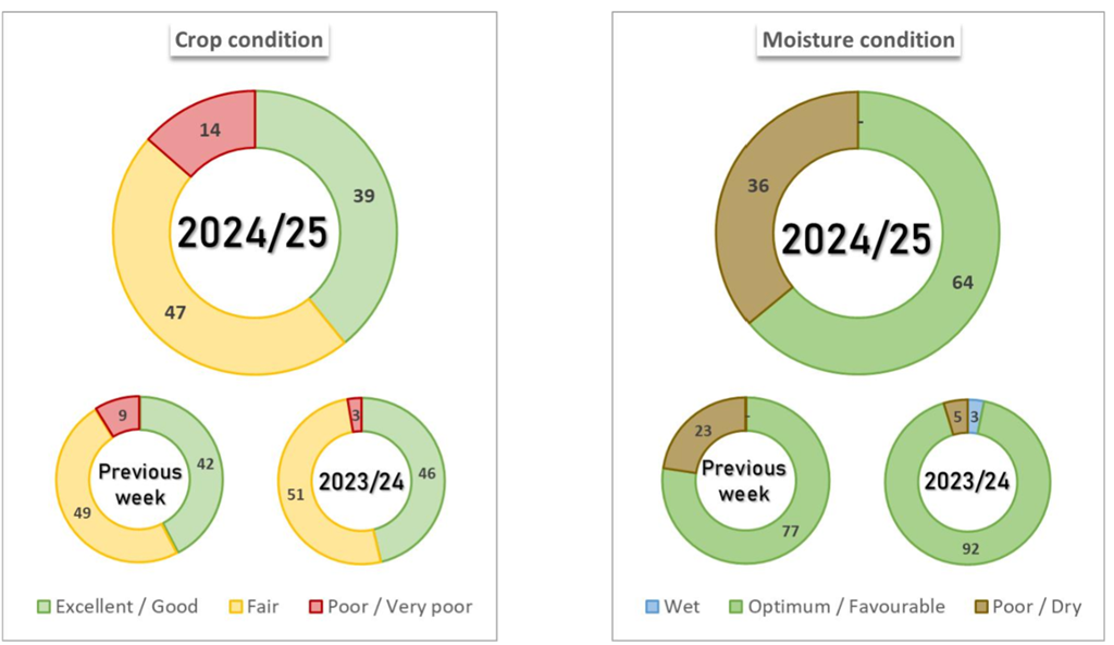 Après un début de semaine chaude et sèche, des pluies ont touché le centre et le sud de l'Argentine au cours du week-end, les zones du nord restant principalement sèches. Les conditions devraient être légèrement plus humides et plus fraîches dans la région par rapport à la semaine dernière. Cependant, des températures supérieures à la normale et des précipitations inférieures à la normale continueront de peser sur la croissance des cultures.