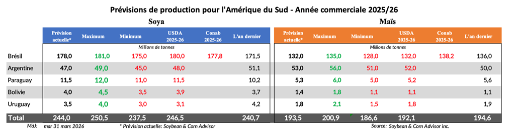 Pour réduire les coûts des intrants en soya, les producteurs brésiliens pourraient diminuer leurs applications de phosphates et « puiser » dans la fertilité déjà présente dans le sol. Si la météo collabore durant la saison de croissance, les rendements du soya pourraient tout de même demeurer satisfaisants. En résumé : des prix élevés des engrais pourraient avoir un impact plus important sur les superficies et la production de maïs brésilien que sur celles du soya.