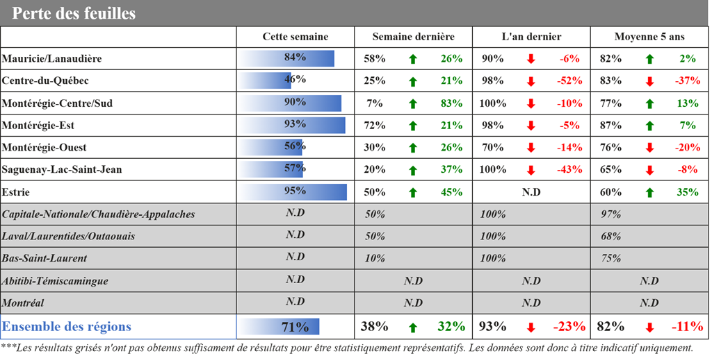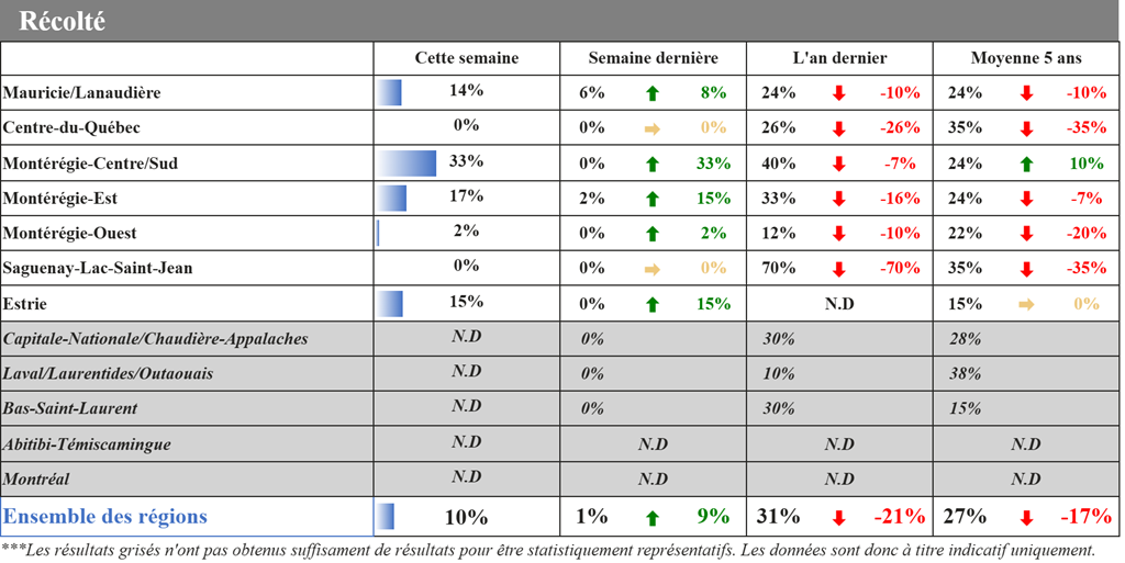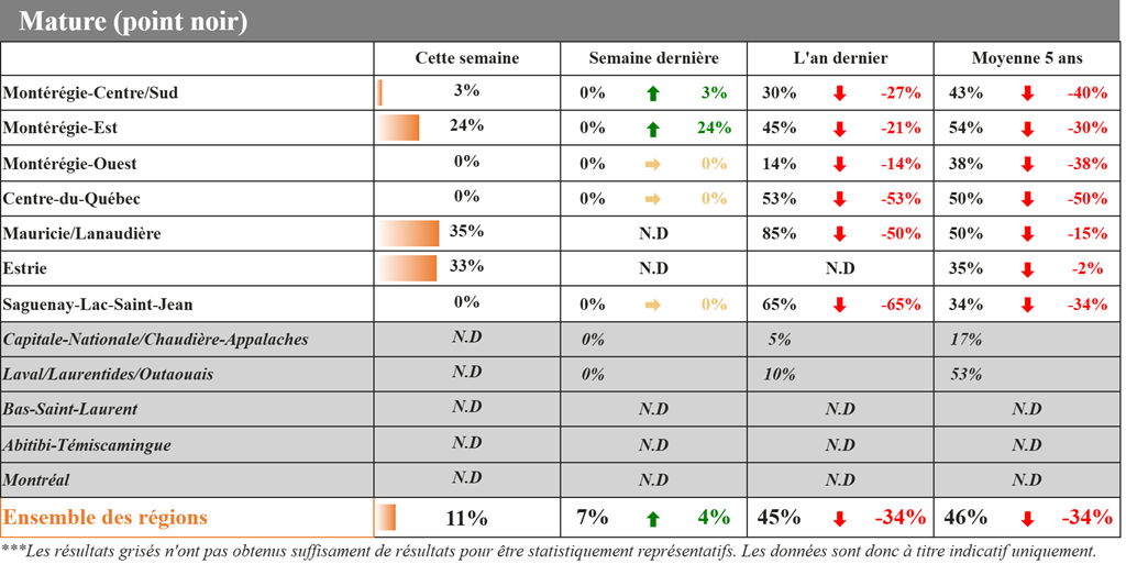 Les récoltes de soya ont débuté pour certains et le seront bientôt pour plusieurs autres. Alors qu’on parlait d’un retard de plus de 30 % sur le stade au début du mois, on constate un rattrapage au niveau de la maturité dans le soya avec un retard qui se situe maintenant à 11 % par rapport à la moyenne 5 ans.