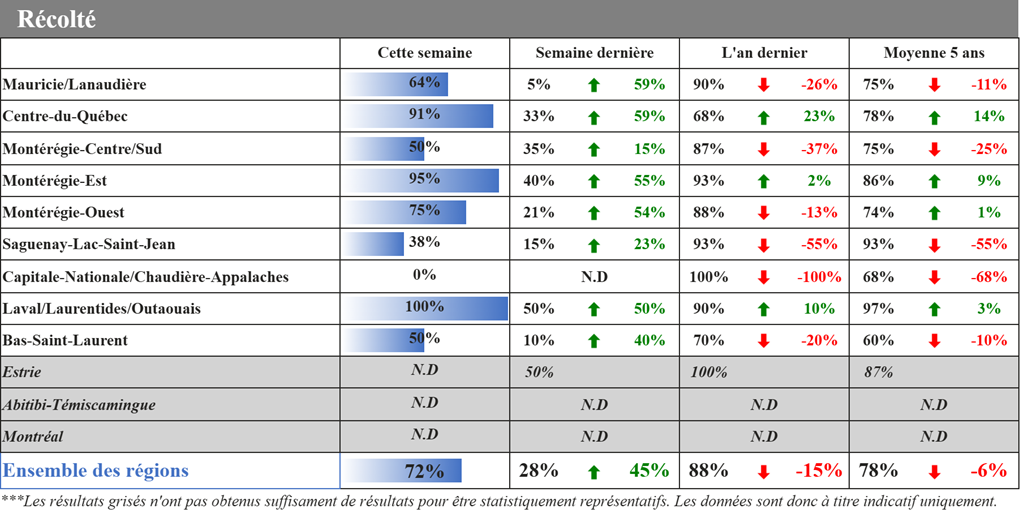 Avec plus de 70 % des récoltes complétées, un grand bond en avant a été fait au cours des derniers jours. Malgré les rendements très variables, les conditions sont exceptionnelles pour récolter et compléter les travaux de la saison