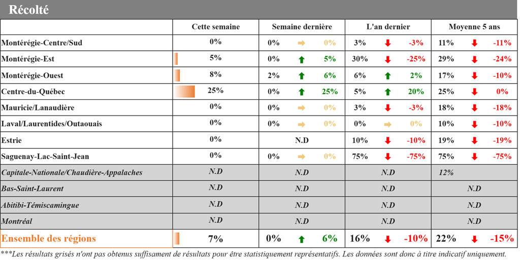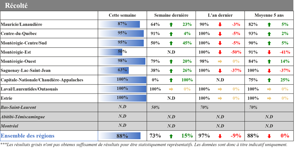 Les récoltes de maïs-grain ont débuté au cours des derniers jours en Montérégie et au Centre-du-Québec, alors que le soya est bien avancé dans la plupart des régions. La pluie, qui se fait toujours attendre, laisse libre cours aux travaux qui avancent rondement.
