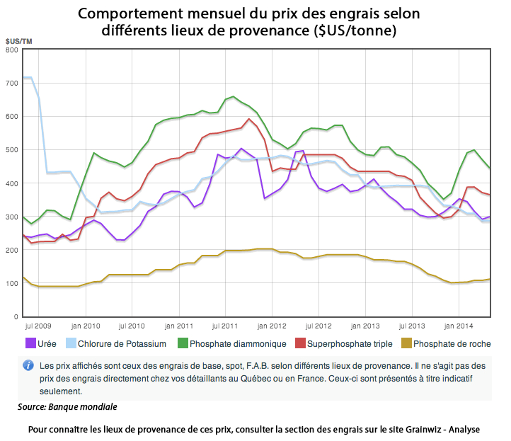 L’offre d’engrais demeure plus qu’adéquate pour l’année à venir, que ce soit du côté de l’azote, comme celui du phosphate et de la potasse. Le recul des prix des grains devrait contribuer également à en ralentir la consommation, accentuant la pression à la baisse sur les prix. Cependant, de nombreuses incertitudes planent toujours sur le marché des engrais. Mentionnons aussi que les prix n’ont pas été aussi bas depuis la fin 2009, début 2010 sur les marchés internationaux, ce qui devrait contribuer progressivement à relancer la consommation si les prix des grains peuvent se stabiliser.