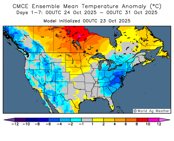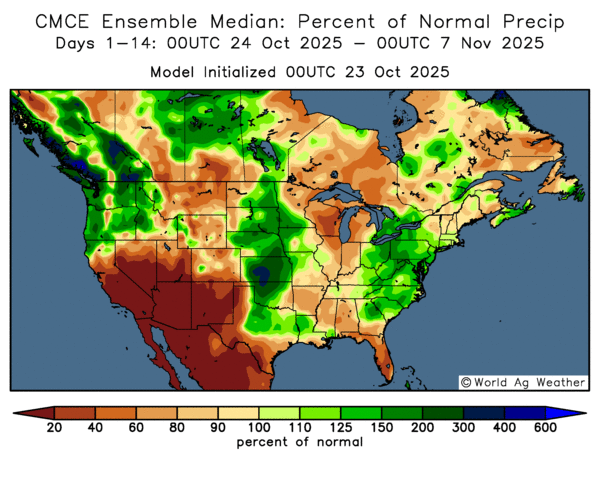 Les cartes de prévisions montrent d’ailleurs que les précipitations prévues pour les deux prochaines semaines devraient demeurer légèrement sous les normales, tout comme les températures, attendues en baisse pour la semaine à venir (source : Grainwiz).