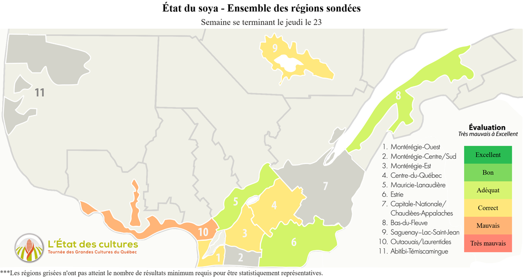 Pour Michaël Mathieu d’Agri C.M.M. senc dans le Bas-Saint-Laurent: «On a complété notre récolte de soya samedi dernier! Les rendements étaient corrects à ordinaires pour nous cette année. La pluie va aider le blé d’automne qui est plutôt stagnant avec le manque d’eau.»