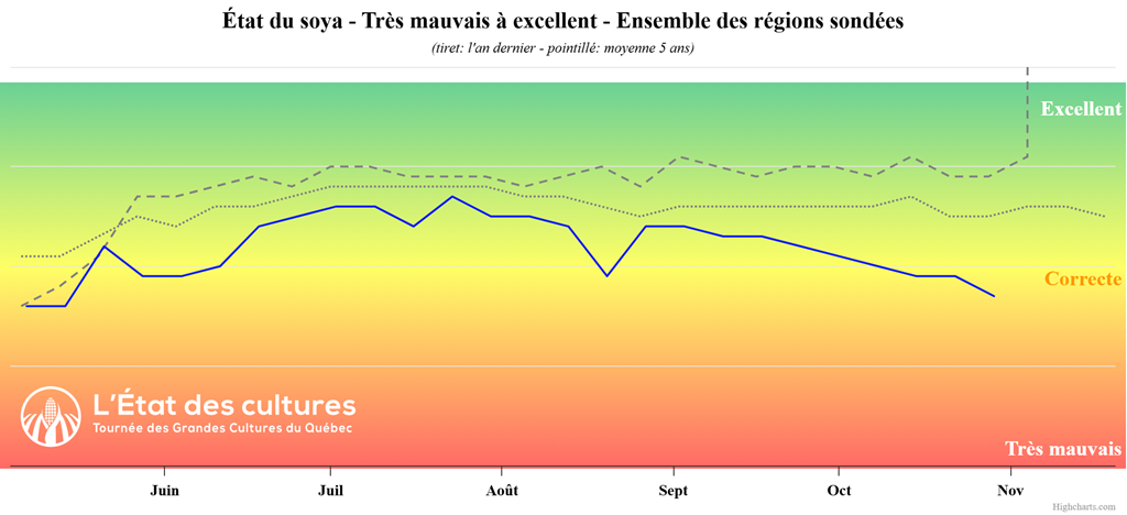 La croissance est terminée, mais la météo continue de faire parler d’elle! Le tableau du cumul de précipitations 2025 au Québec du site de la Tournée des grandes cultures du Québec est frappant avec une courbe qui s’éloigne largement des références habituelles.