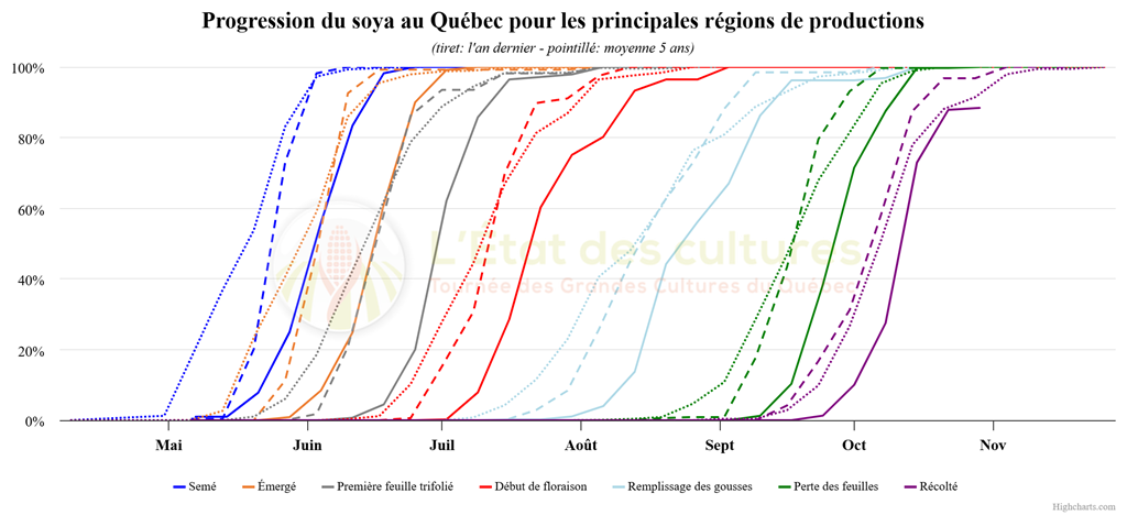 Il y a tout de même eu un peu d’action durant la fin de semaine dernière alors que plusieurs ont profité du temps encore sec pour avancer dans les champs, permettant d’avancer le soya dans plusieurs régions et de faire quelques hectares de maïs, avant que la pluie ne s’installe pour de bon.